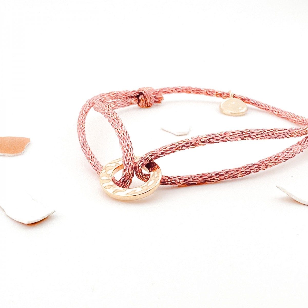 Le bracelet coulissant Nina, un bracelet en cordon Mokuba rose gold avec une médaille ronde en laiton doré 3 microns.