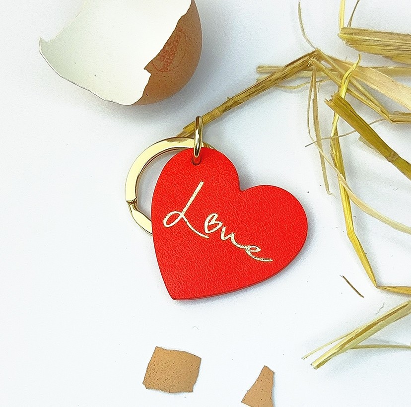Porte-clés en cuir corail en forme de coeur. Dorure à chaud.