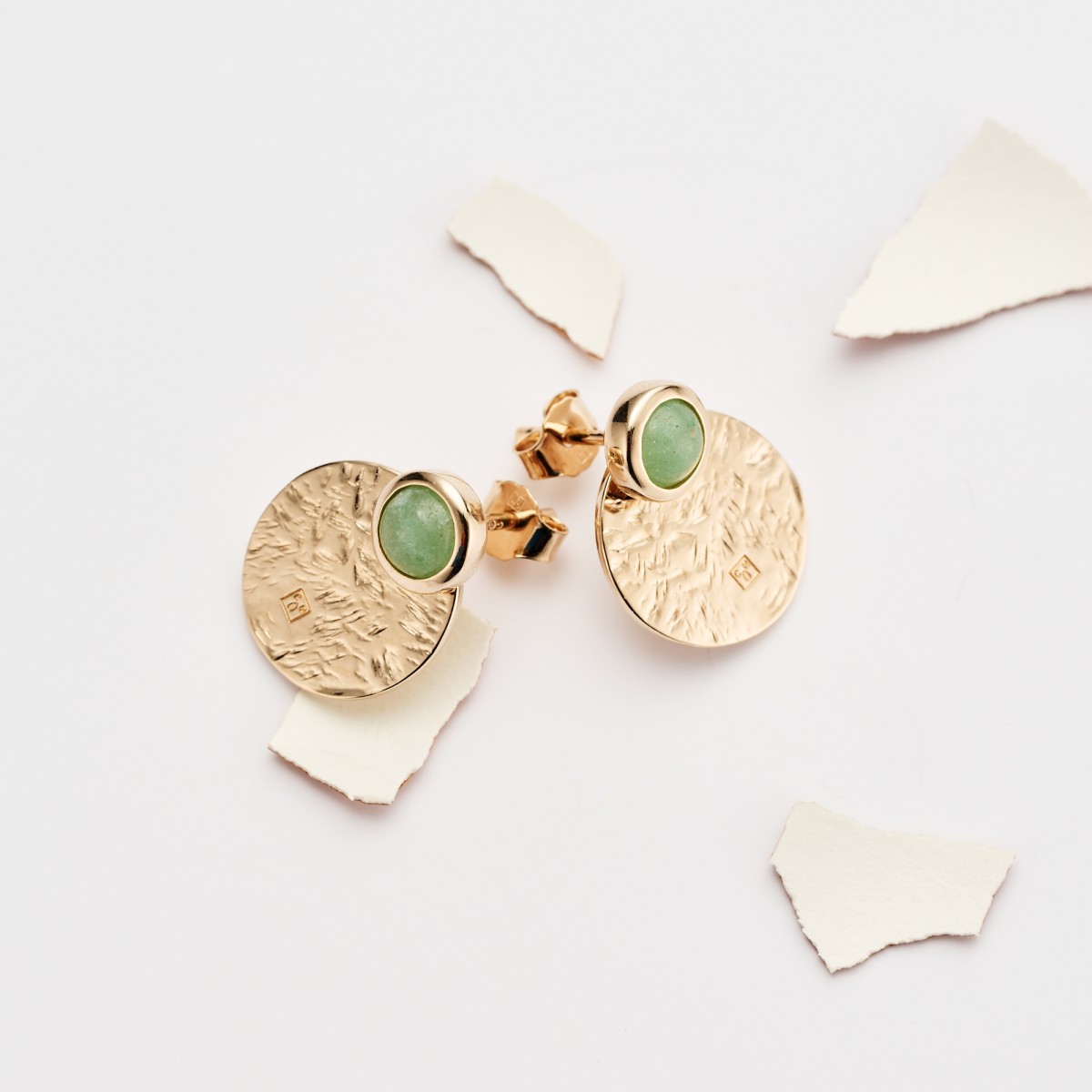Boucles d’oreilles puces en plaqué or 3 microns avec pierre en Aventurine et pastille martelée. Fermeture papillon.