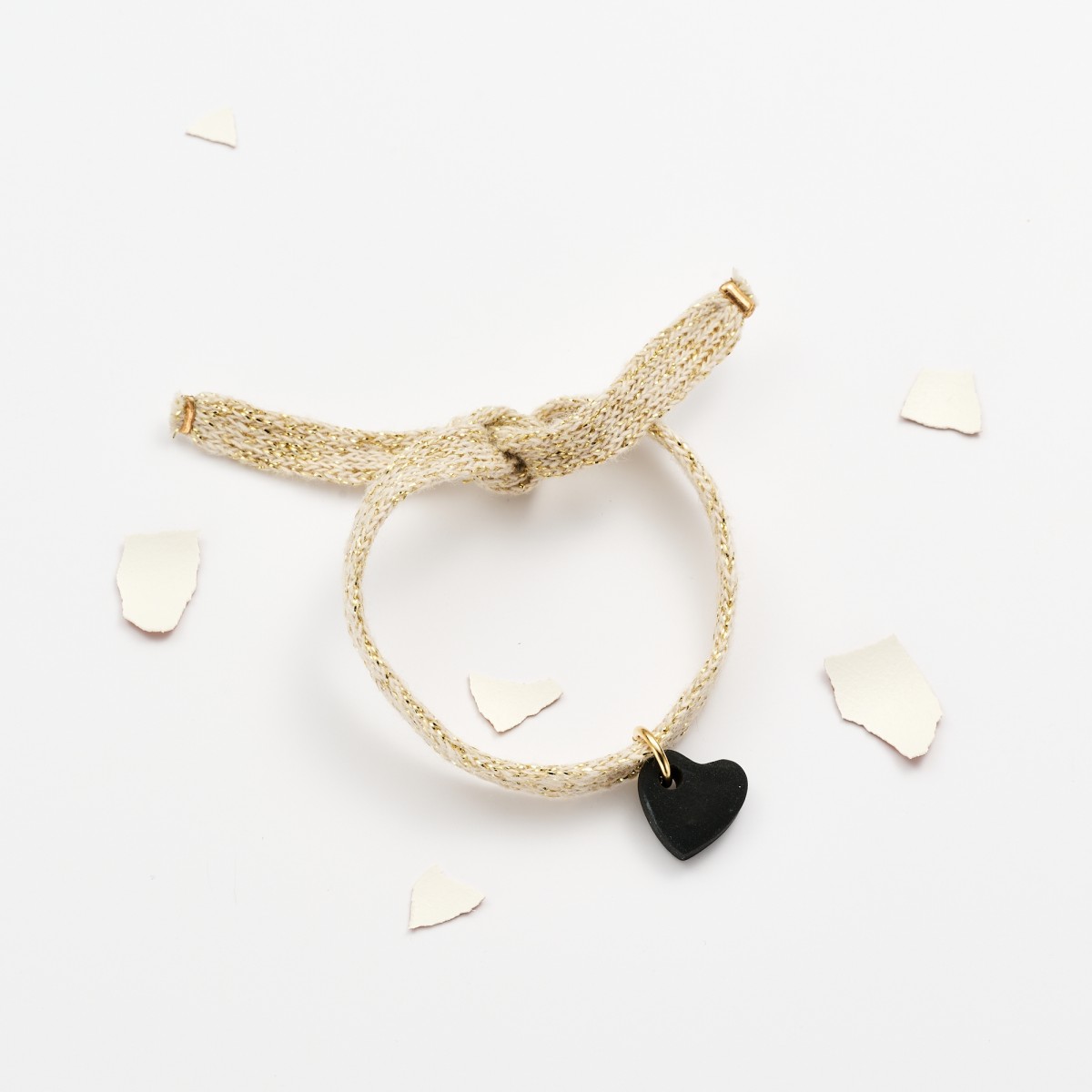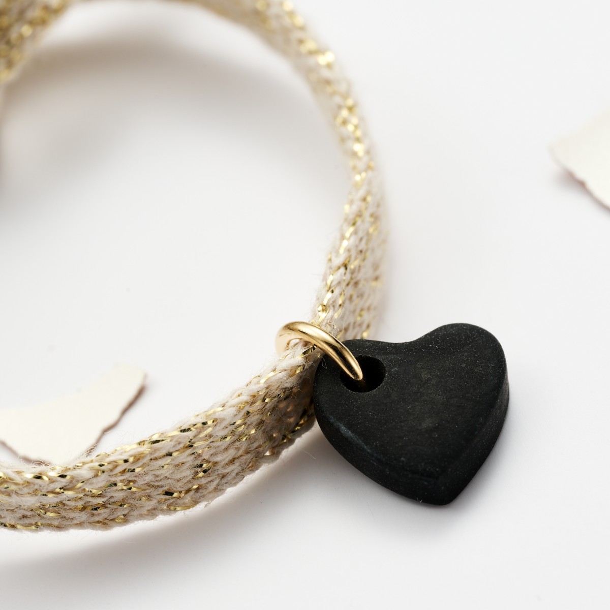 Bracelet à nouer en coton recyclé beige doré, avec pendentif cœur en argile polymère noir.