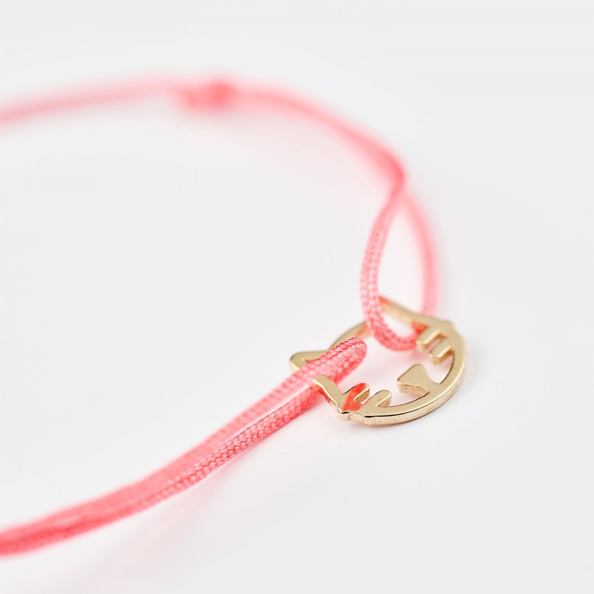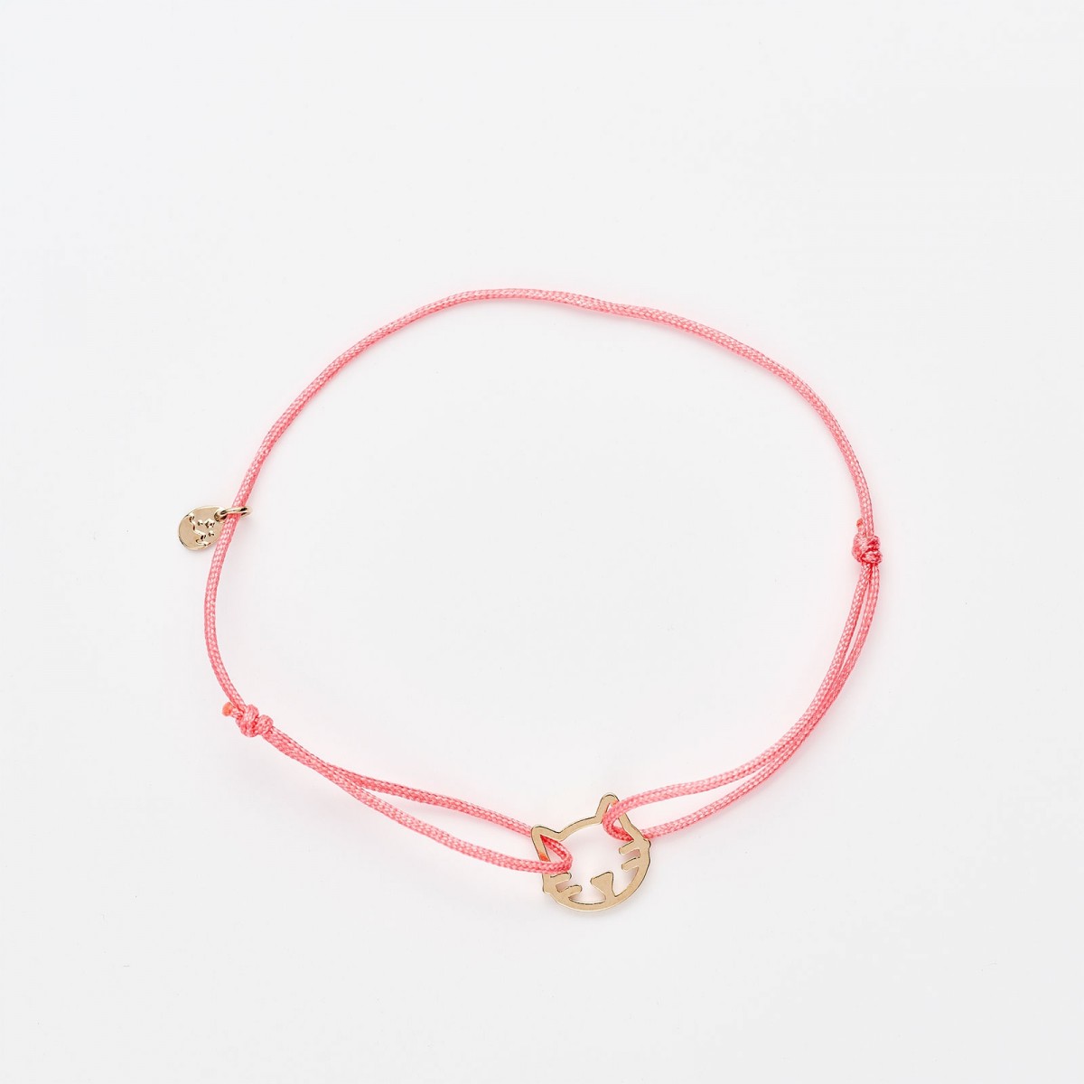 Chat en laiton, doré à l’or fin 3 microns. Cordon en nylon : rose.