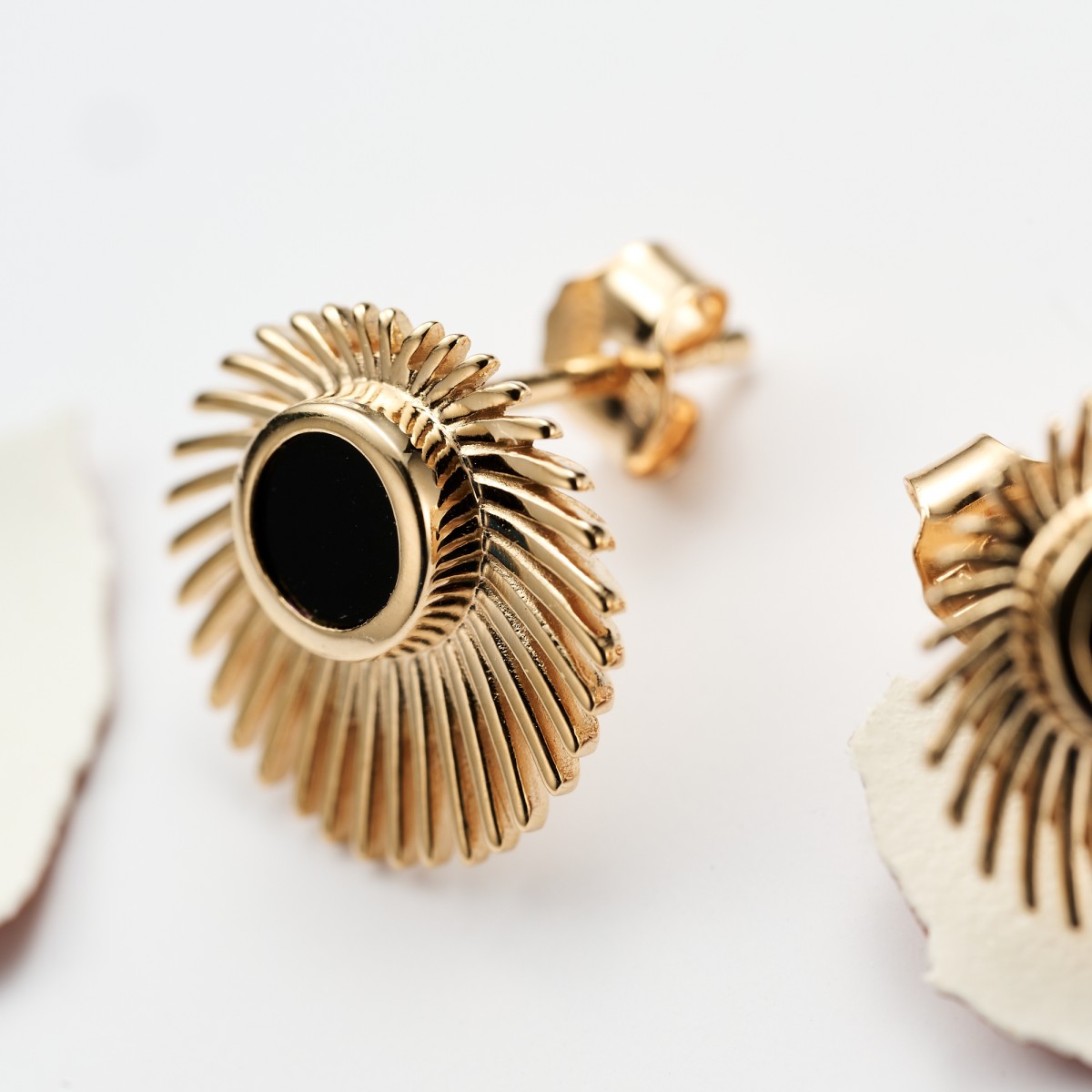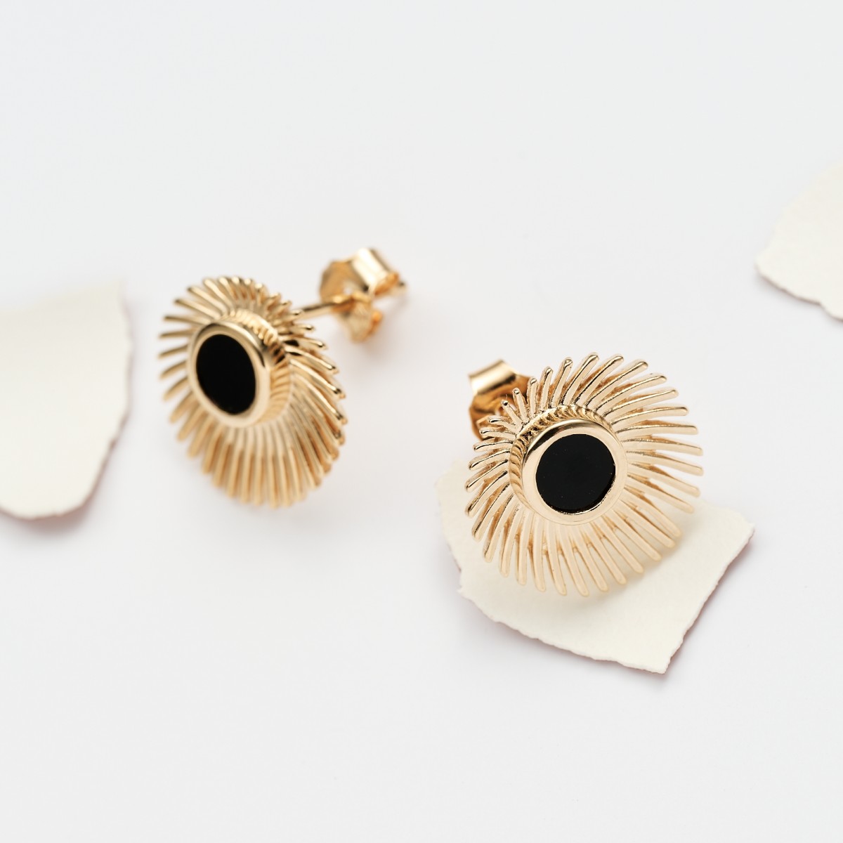 Boucles d’oreilles puces en plaqué or 3 microns. Soleil avec insert en Agate noire. Fermeture papillon.