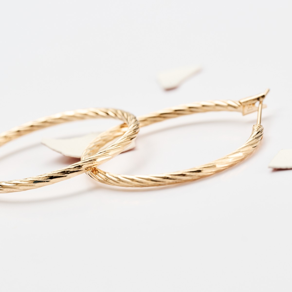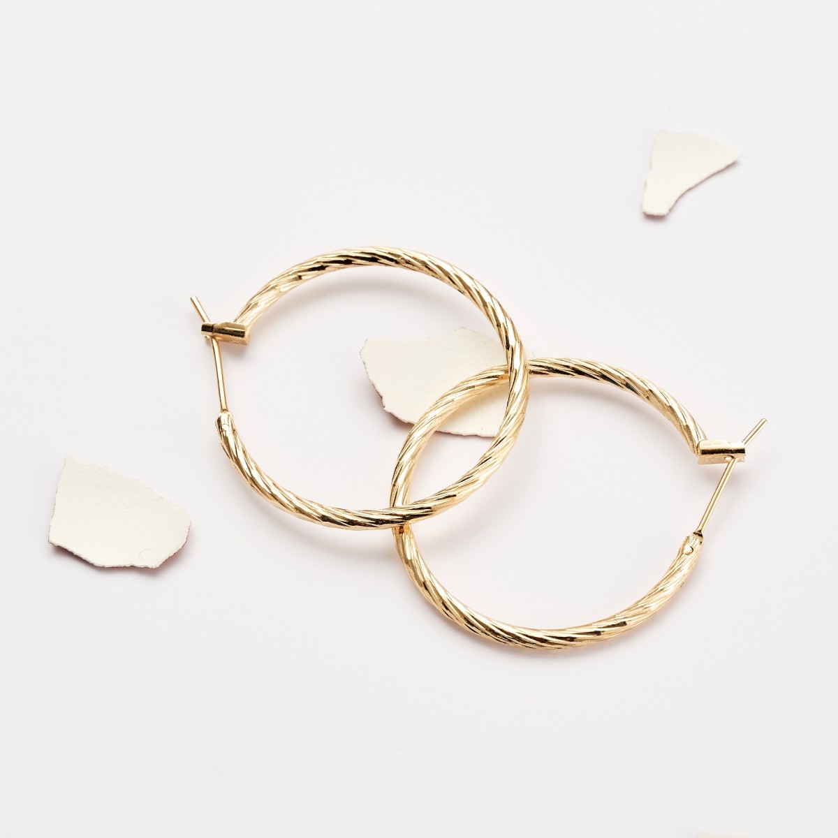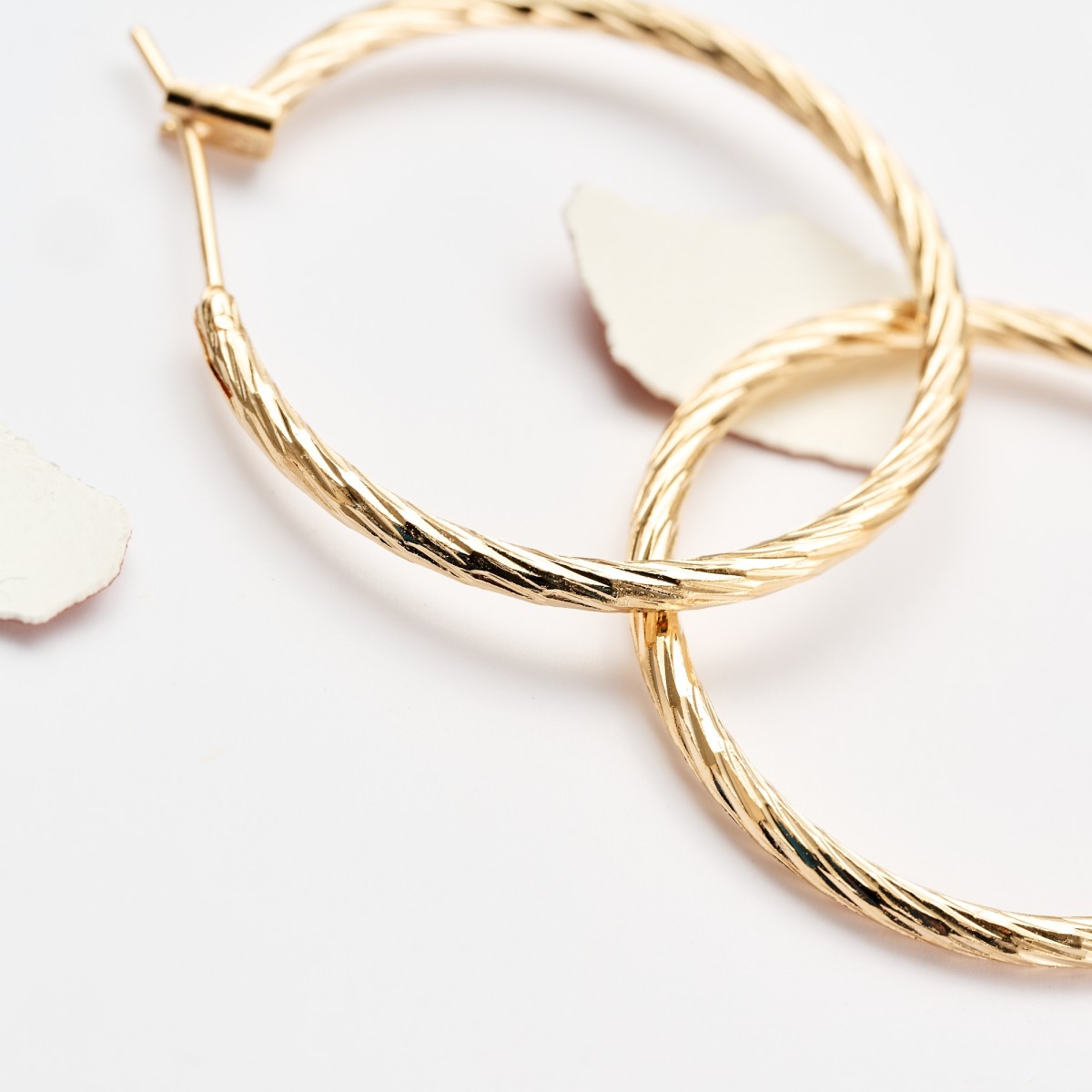 Boucles d’oreilles créoles torsadées en plaqué or 3 microns. Diamètre : 3 cm.