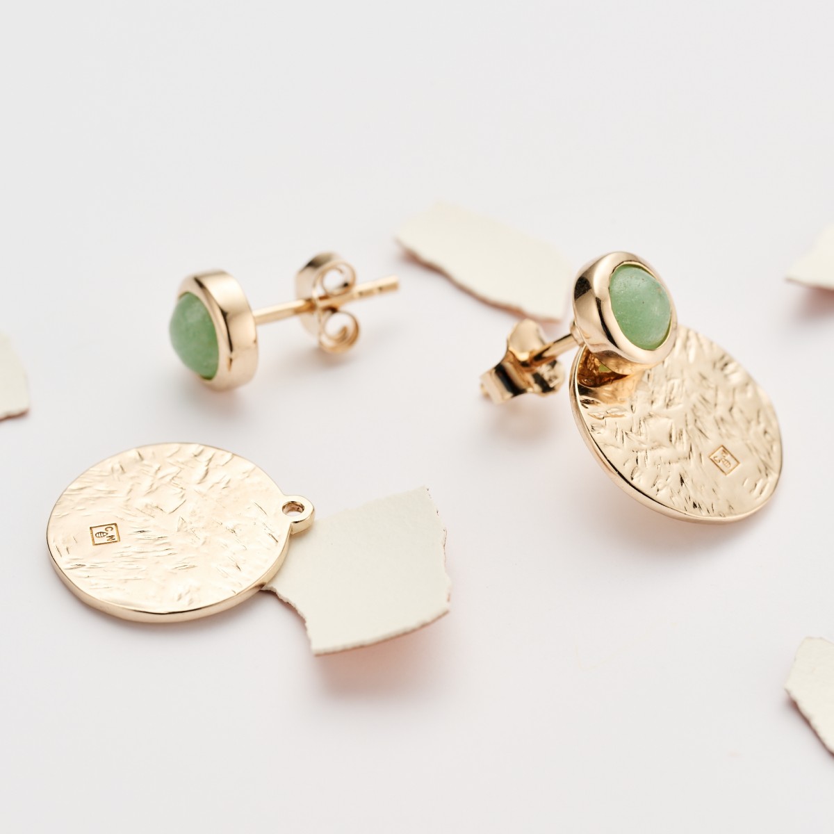 Boucles d’oreilles puces en plaqué or 3 microns avec pierre en Aventurine et pastille martelée. Fermeture papillon.