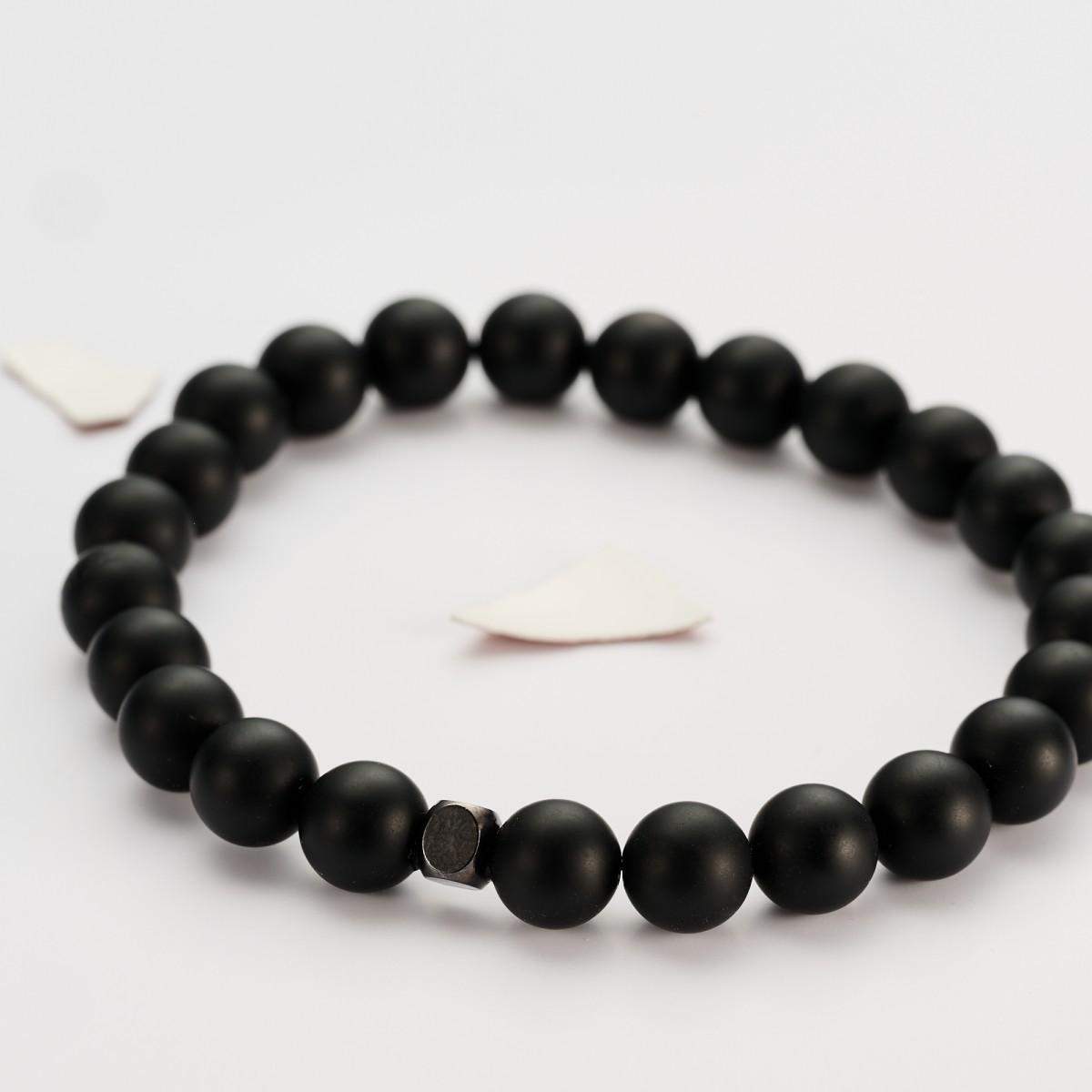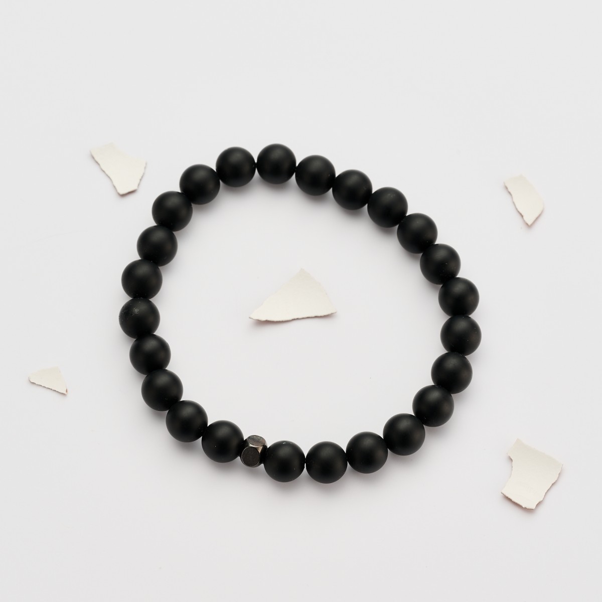 Bracelet homme HOMYX, en perles d'ONYX noir mat avec perles laiton dorure GUN.Bracelet élastique afin de s'adapter à chaque poignet. Fabriqué avec amour au poulailler et caché dans un oeuf de poule.