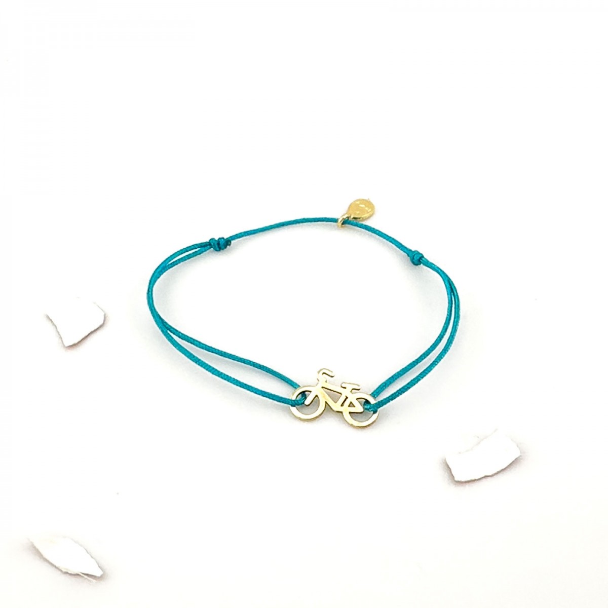 Pour votre mini maillot jaune, le bracelet vélo. Adaptable à tous les poignets jusqu'à 12 ans, le bracelet est composé d'un vélo d'une longueur de 1,2cm et d'un cordon bleu turquoise.Bracelet coulissant,en laiton doré 3 microns. Convient à un petit bout de moins de 12 ans.