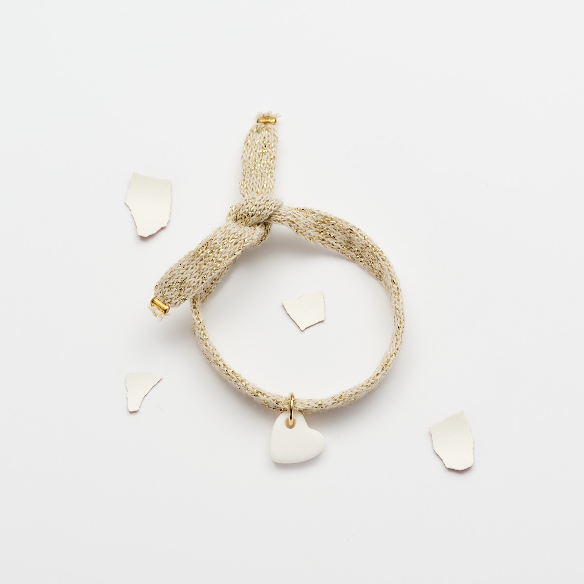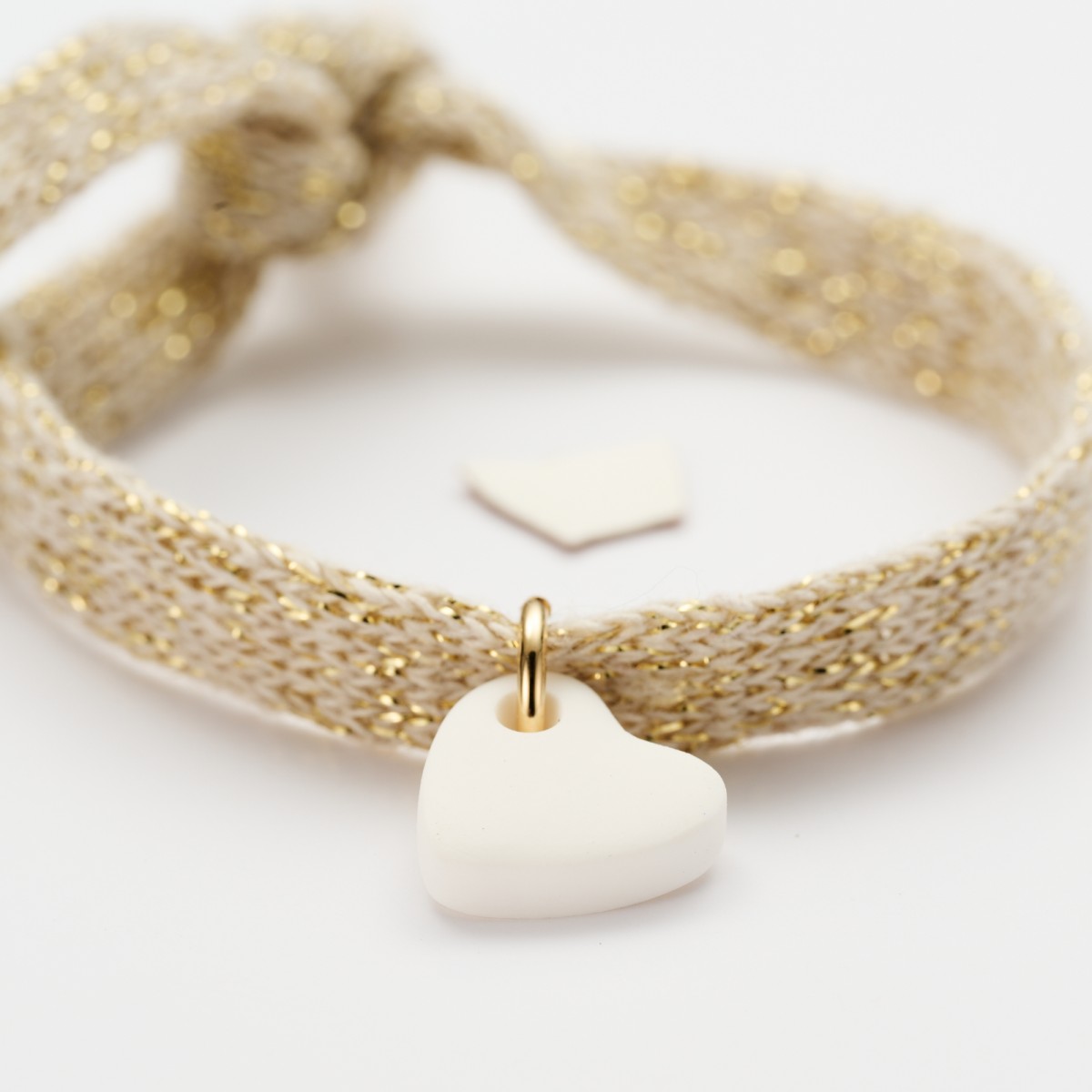 Bracelet à nouer en coton recyclé beige doré, avec pendentif cœur en argile polymère blanc.