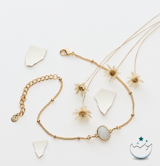 Bracelet chaîne perlée avec chaînette de rallonge en laiton doré 3 microns avec breloque en Pierre de Lune. Il apportera tous les bienfaits des pierres à celle qui le portera (Pierre de Lune : Pierre de la féminité. Rééquilibre le sommeil. Calme l’hyperactivité).