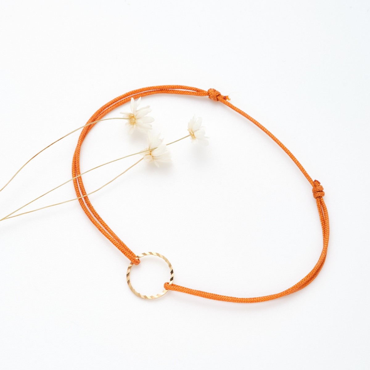 Bracelet coulissant disponible dans 16 couleurs au choix avec son petit rond en plaqué or. Adaptable à tous les poignets.
