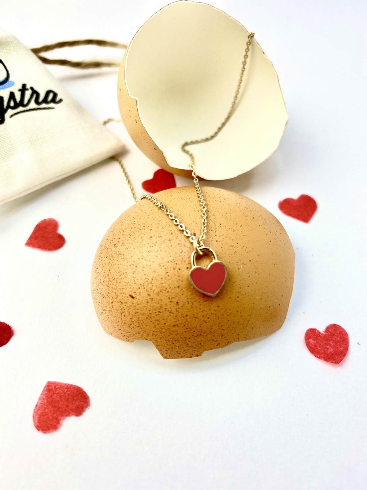 Collier "A la folie" en laiton doré à l'or fin. Cœur résiné en rouge.
