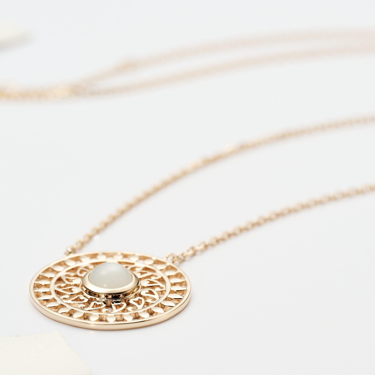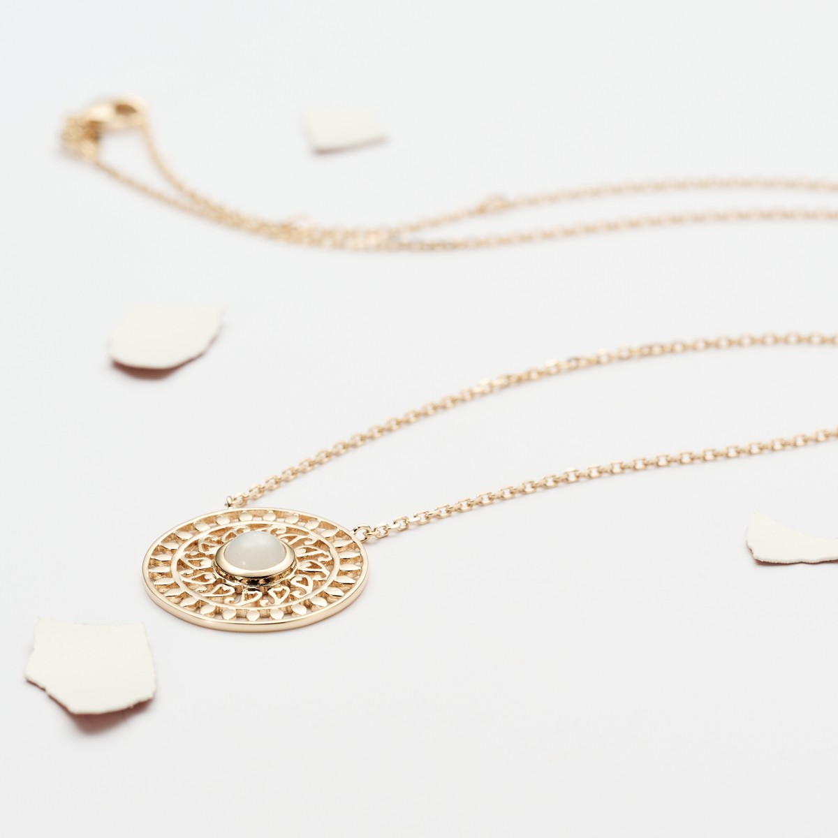 Collier en plaqué or 3 microns avec médaille soleil en pierre de lune.Longueur : 42cm.