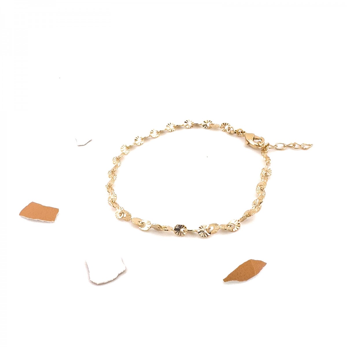 On aime ses reflets lumineux et son look intemporel.Bracelet en laiton doré 3 microns. Longueur : 18 cm avec chaînette de rallonge.