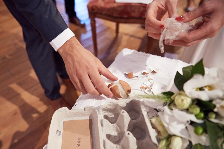 Pour leur mariage, Lucie et Vincent nous ont fait confiance pour dissimuler leurs alliances dans des œufs ! Résultat : une assemblée divertie, un prête amusé et des bagues enfilées.