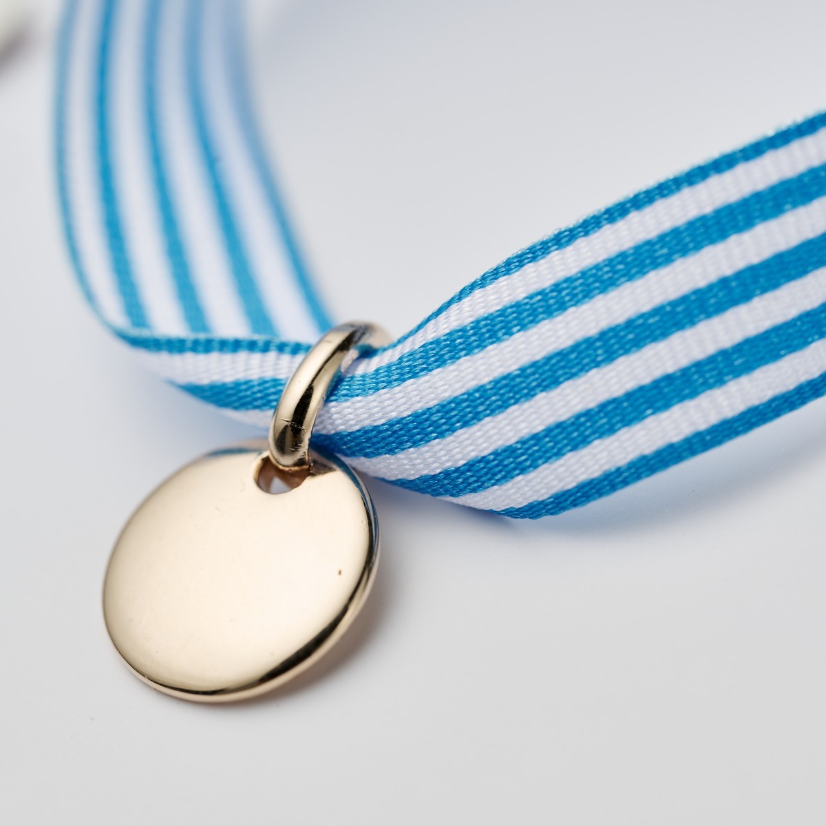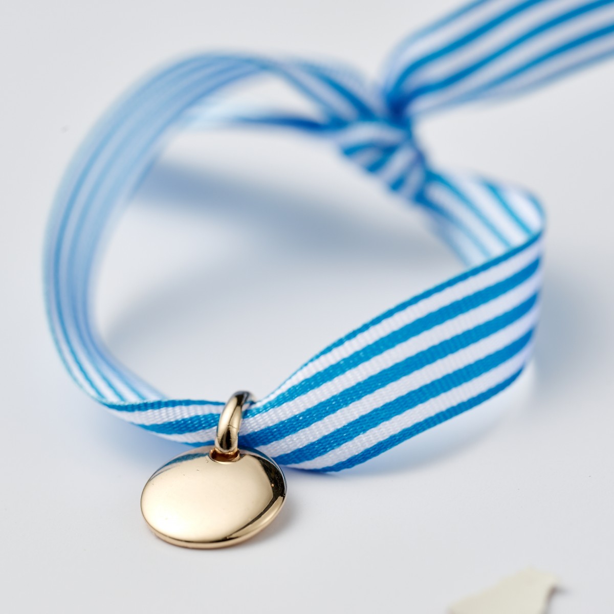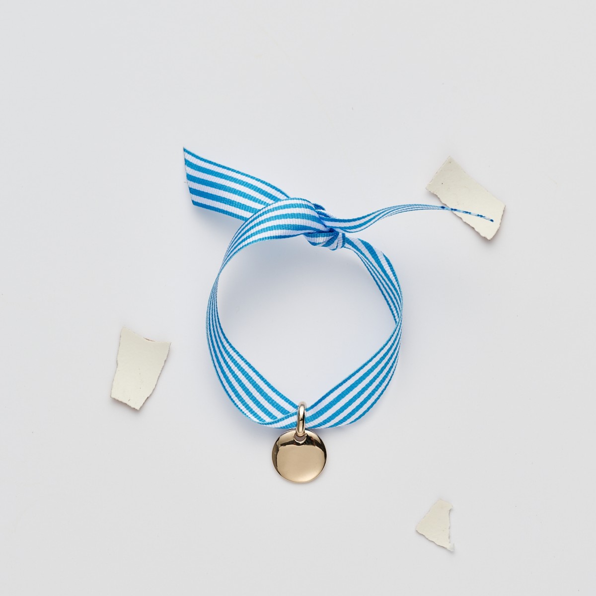 Bracelet Cabane, Bracelet en ruban à nouer 9 mm de couleur et pendentif en plaqué or 3 microns. Rayure bleu et blanc Fabriqué au poulailler et caché dans un oeuf de poule l'Eggstra.