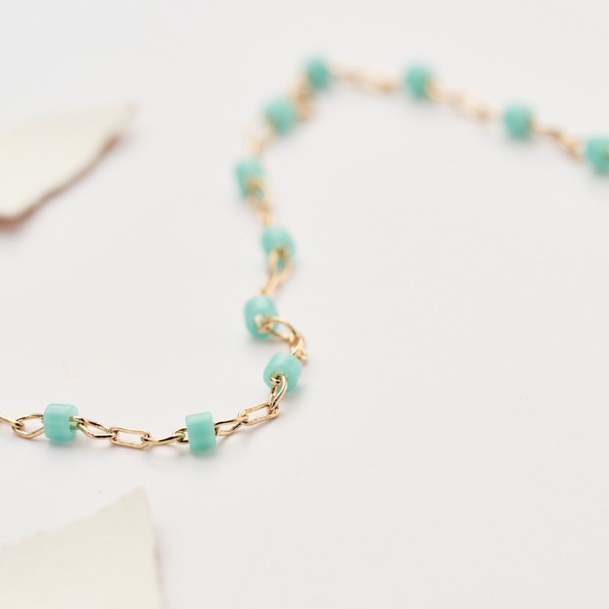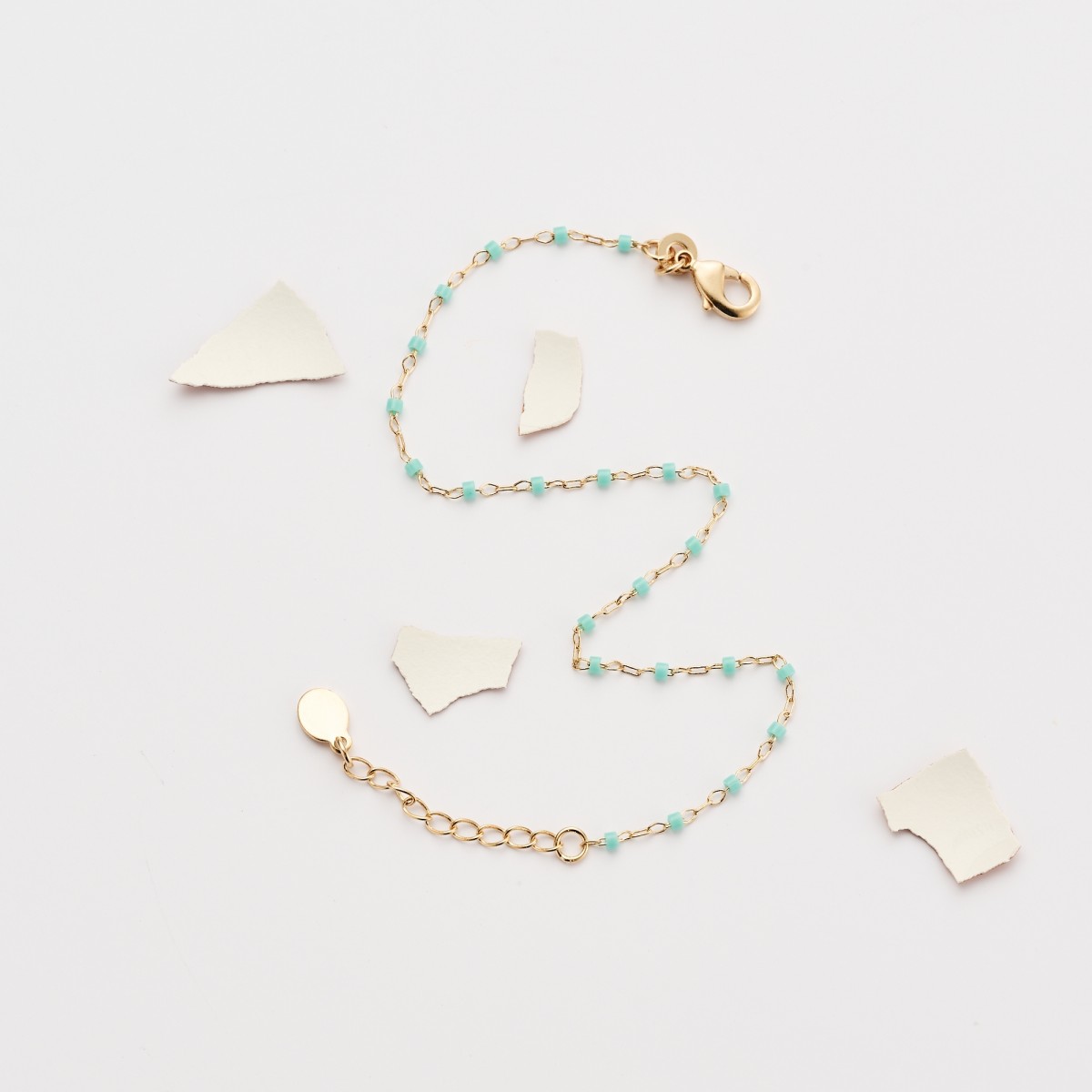 Bracelet plumetis en plaqué or et perles Miyuki. Disponible en 4 couleurs : blanc, noir, turquoise et rouge. Avec chaînette de rallonge. Caché dans une coquille d'œuf.