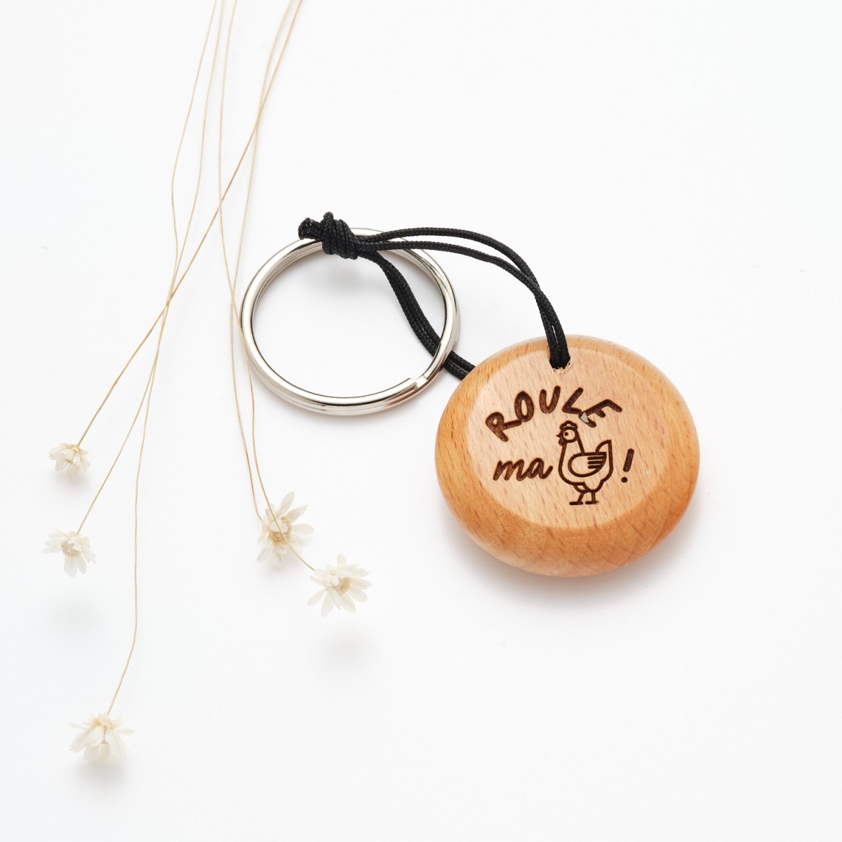 Porte Clé Bois gravé "Roule ma Poule" lien noir
